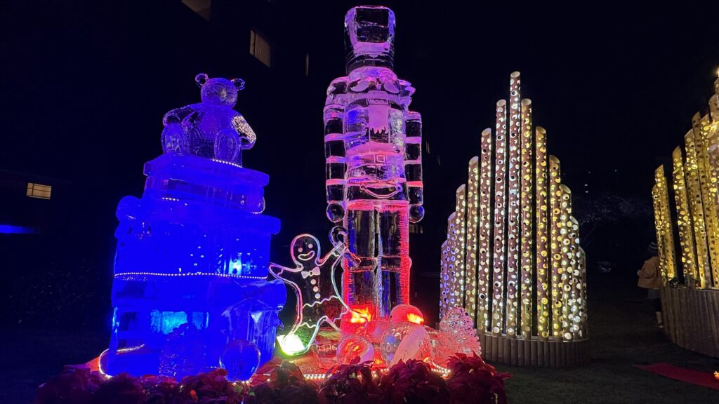 今年は“くるみ割り人形”をテーマに開催され、日本庭園にクリスマスツリーとともにくるみ割り人形の氷彫刻が飾られ大変美しい点灯式となりました。